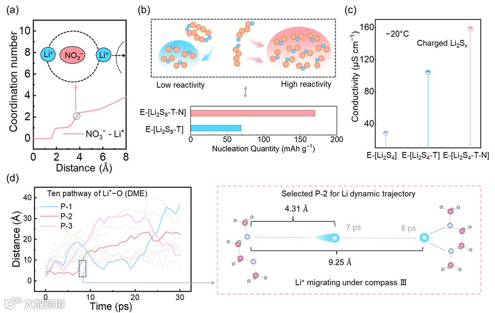 图3. 低温下对带电多硫化物电解液的分析。(a) 根据 −20℃ 下的径向分布函数得到的以NO3− 为中心Li+的配位数。(b) 基于 E-[Li2S8-T]、E-[Li2S8-T-N] 电解质在 −20℃ 下的形核测试。(c) E-[Li2S4]、E-[Li2S4-T]、E-[Li2S4-T-N] 电解液在 −20℃ 时的离子电导率。(d) Li - O 的距离随时间的变化,以显示 Li 的迁移路径。锂-氧长度分布的三个路径(P-1、P-2 和 P-3)被随机突出显示,其中 P-2 被选中,以示意性地说明锂的跳跃机制。