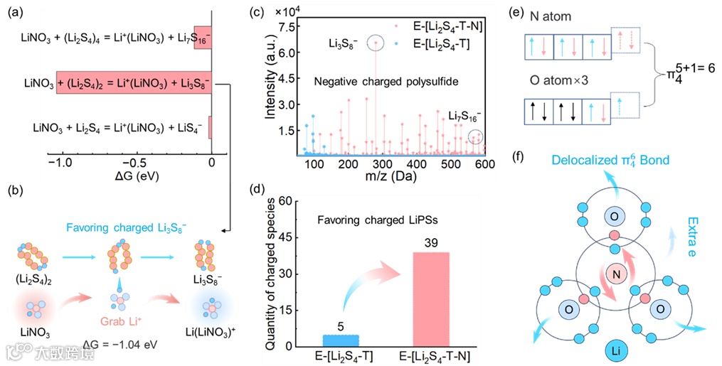图2. 硝酸锂与多硫化锂的锂离子争夺机制。(a) 各种竞争反应的吉布斯反应自由能(ΔG)。(b) LiNO3 捕获 Li+并从 (Li2S4)2 生成 Li3S8−的示意图。(c) E-[Li2S4-T] 和 E-[Li2S4-T-N] 电解液的离子质谱。(d) 基于离子质谱的带电 LiPSs 物种数量。(e) LiNO3 的电子阵列图。实线框表示σ键的参与,虚线框表示π键的参与。(f) LiNO3中大π键的形成。