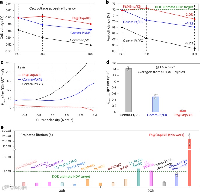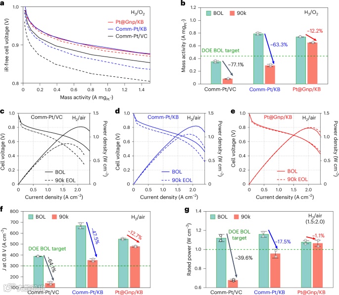 3 电压效率分析表明,Pt@Gnp/KB燃料电池初始峰值效率达到71.9%,且在AST后仅下降2.0%,明显优于商用催化剂。(图3 a-b)