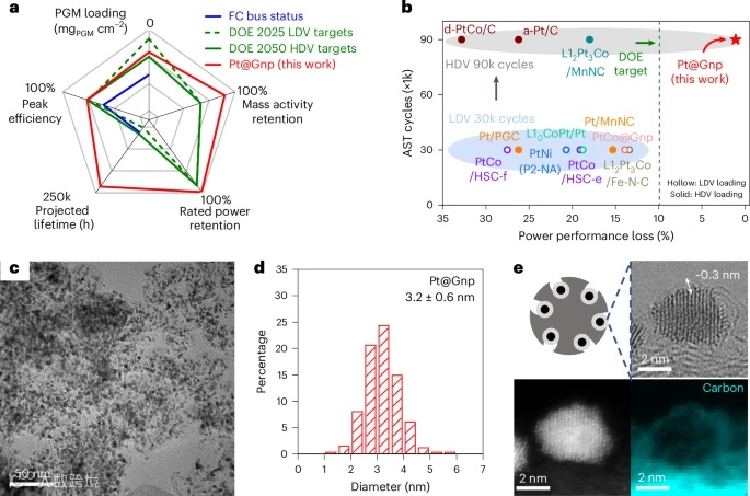 然而,重型车辆的独特运行条件对燃料电池提出了更高的要求。重型车辆的行驶里程通常是轻型车辆的六倍、燃料消耗超过八倍,迫使燃料电池必须在耐久性和能效上实现质的飞跃。为此,美国能源部为重型车辆制定了燃料电池寿命由8,000小时提升至30,000小时、效率由70%提升至72%的严格目标。实现这一目标需要催化剂在高电流密度区域保持90%以上的功率性能以保障启动和加速的功率输出,同时在低电流密度区域具备高催化活性以满足长时间巡航的高燃料效率。目前,尚未有催化剂能这些指标。