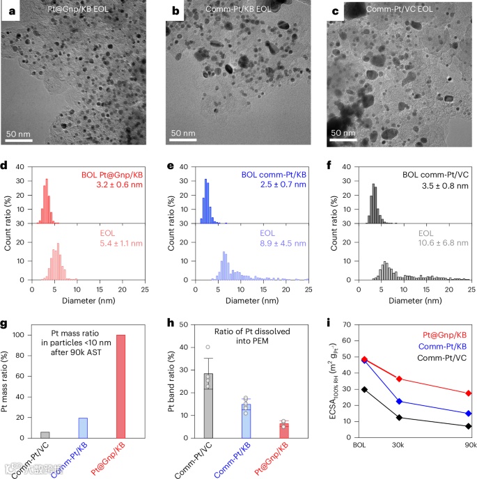 1 在H₂/O₂条件下,Pt@Gnp/KB的氧还原反应质量活性(MA)为0.74 A/mgPt,与商用Pt/KB相当(0.79 A/mgPt),远高于商用Pt/VC(0.35 A/mgPt),且在AST后MA保持率达87.8,EOL MA为0.65 A/mgPt,分别是商用Pt/KB和Pt/VC的2.2倍及8.1倍。(图2 a-b)