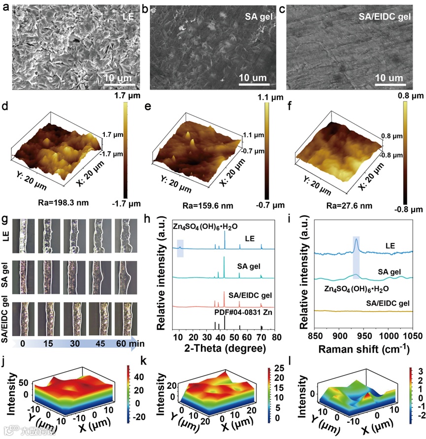 图5. (a) LE, (b) SA凝胶和(c)SA/EIDC凝胶在1 mA cm-2, 1 mAh cm-2下循环50次后的Zn阳极SEM图像;使用(d) LE, (e) SA凝胶和(f) SA/EIDC凝胶在1 mA cm-2, 1 mAh cm-2下对Zn阳极的AFM图像;(g)原位观察各种电解质中的枝晶;(h)不同电解质锌阳极循环50次后的XRD图谱;(i)锌阳极50次循环后的拉曼光谱及对应的映射图