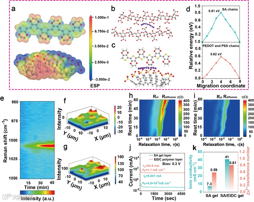 图3. (a) PEDOT链和PSS链的ESP分布;(b) Zn2+离子沿SA分子链的迁移路径;(c)Zn2+离子沿PSS和PEDOT分子链的迁移路径;(d) SA凝胶层和EIDC聚合物层迁移能垒的比较;(e) SA/EIDC凝胶中ZnSO4的原位拉曼光谱;(f)锌沉积前后的拉曼测绘图;(h) SA凝胶电解质和(i) SA/EIDC凝胶电解质对Zn/ Zn对称电池的DRT分析;(j) SA凝胶层和EIDC聚合物层的电导率;(k)离子电导率与Zn2+转移数的比较。