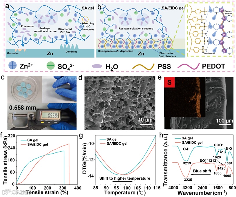 图1. (a) SA凝胶电解质和(b) SA/EIDC凝胶电解质中Zn阳极的示意图;(c) SA/EIDC凝胶电解质薄膜光学图像;(d) SA/EIDC凝胶冻干后的SEM图像;(e)截面SEM和相应的元素映射图;(f) SA凝胶膜和SA/EIDC凝胶膜的拉伸应力-应变曲线;(g) SA凝胶和SA/EIDC凝胶的DTG曲线;(h) SA凝胶和SA/EIDC凝胶的FTIR光谱。
