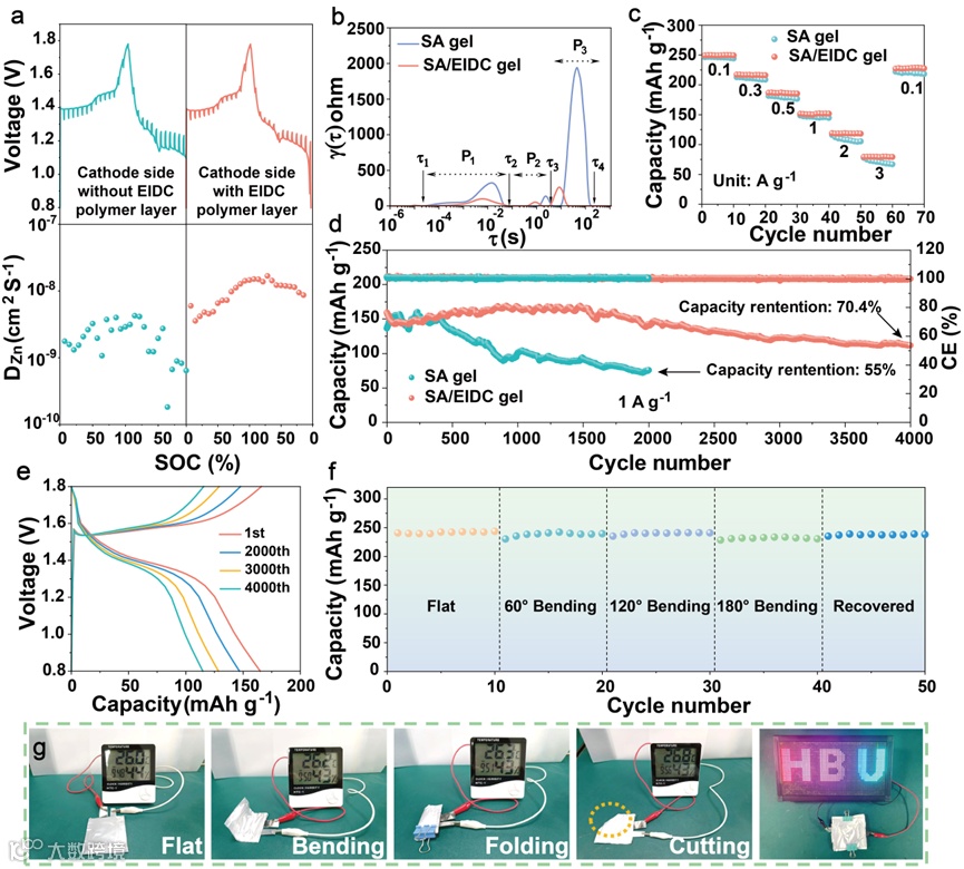 图6. (a)使用不同电解质(EIDC聚合物层仅存在于Zn负极一侧或存在于Zn负极和MnO2正极两侧)的电池的GITT测试和相应的DZn值;(b) SA凝胶电解质和SA/EIDC凝胶电解质对Zn//MnO2全电池的DRT结果分析;(c) SA凝胶电解质和SA/EIDC凝胶电解质的速率性能;(d) SA凝胶电解质和SA/EIDC凝胶电解质的全电池在1 A g-1下的长循环性能,(e)对应的恒流充放电曲线;(f)不同弯曲角度下的容量变化;(g)实物演示。