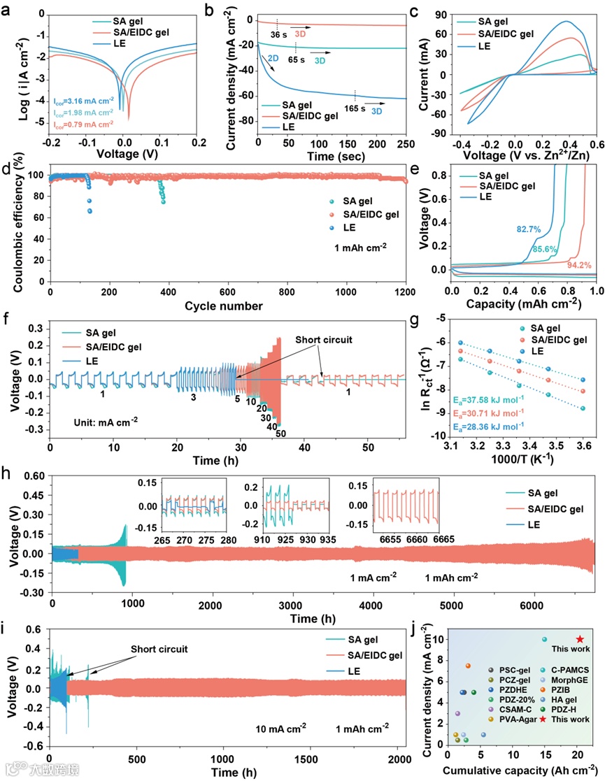 图4. (a)塔菲尔曲线;(b) CA测试;(c) Zn// Cu不对称电池的CV曲线;(d)不同电解质的库仑效率性能和(e)相应的初始电压分布图;(f)评价执行情况;(g)不同电解质的活化能;(h) 1 mA cm-2, 1 mAh cm-2和(i) 10 mA cm-2, 1 mAh cm-2时的恒流循环性能;(j) SA/EIDC凝胶对称电池的电流密度和累积容量与最近报道的文献的比较