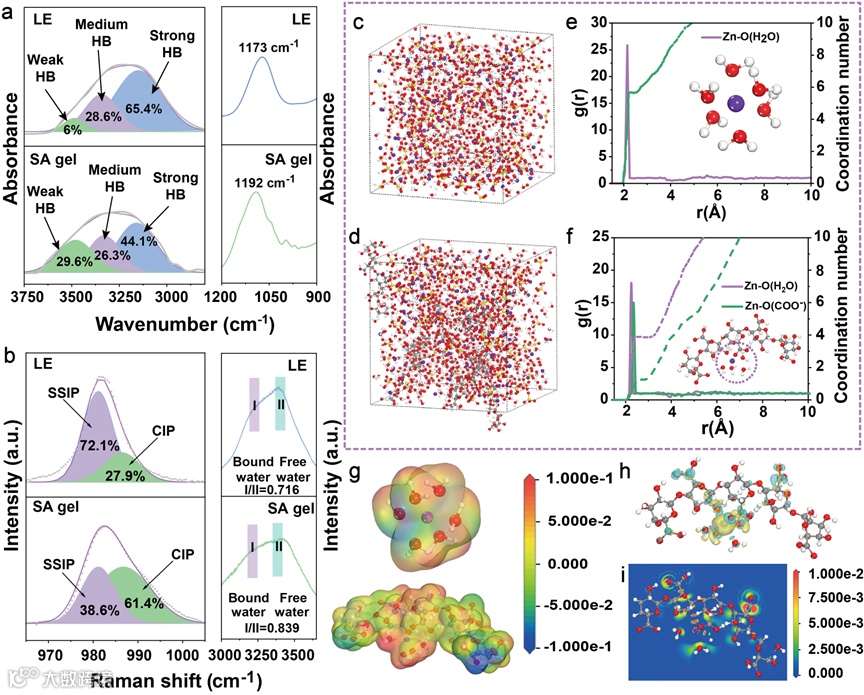 图2. (a) LE和SA凝胶电解质的FTIR拟合光谱;(b) LE和SA凝胶电解质的拉曼光谱;(c) LE和(d) SA凝胶电解质的三维快照;(e) Zn2+-H2O在LE中的RDF及相应的吸附构型;(f)Zn2+- h2o和Zn-COO -在SA凝胶电解质中的RDF及其相应的吸附构型;(g) LE和SA凝胶中Zn2+初级溶剂化壳层的静电电位映射;(h)重塑溶剂化结构[Zn(COO)(H2O)4]+的电荷密度差和(i)相应的电荷密度差的切片映射。