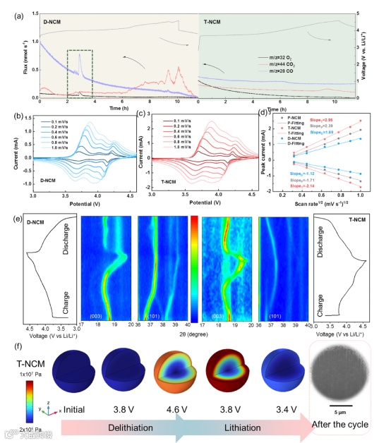 进一步通过原位实验,深入了解该残碱层和快离子层分别对NCM在充放电过程的影响。复合材料T-NCM在充放电过程中相变最小,反应可逆性更高。同时,结合有限元模拟分析和循环后的截面图可以看出,T-NCM颗粒在电化学过程中始终具有最小且最均匀的应力,从而更少产生微裂纹。
