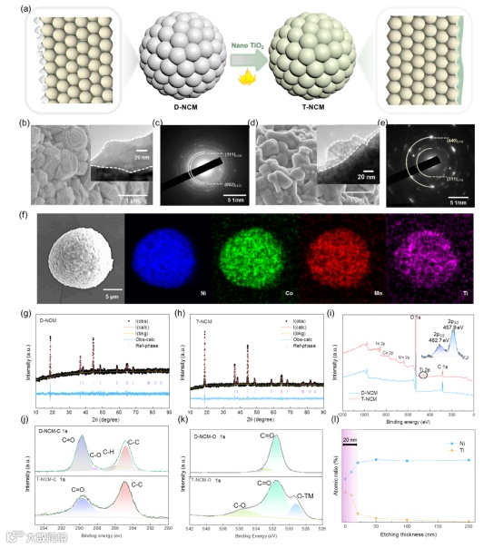 通过简化工艺的化学反应巧妙地解决富镍正极表面残碱导致的失效问题,同时在其表面形成钛基包覆层。所得复合材料T-NCM表面包覆有快离子导体层,内部结构也得到了很大的改善,阳离子混合明显减少,层状结构更加明显。