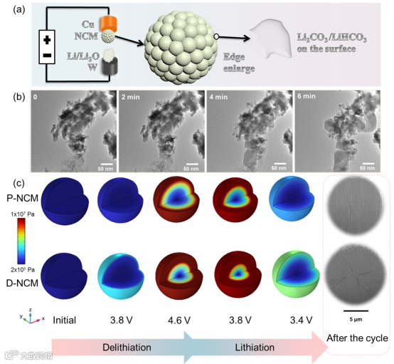 通过原位透射电镜可以清楚地看到,随着Li+的脱出,D-NCM的表面形貌发生了明显的变化。进一步通过有限元模拟对P-NCM和D-NCM颗粒内部的应力分布进行了分析,表面残碱严重影响了高镍正极材料的电化学反应动力学。随着循环的进行,D-NCM颗粒的内应力积累不可避免地导致其快速衰减。从最右侧颗粒循环后的截面图中可以清楚地看到,循环后的D-NCM样品内部产生了更多的微裂纹。