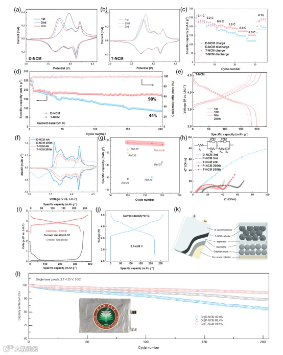 除了正极颗粒本身外,它们的表面正极电解质界面的稳定性,也影响着电池的电化学性能。除此之外,单层软包循环200次后,T-NCM的产气量也最少。这是因为在T-NCM电极中Li+输运迅速,反应更均匀,再加上稳定的CEI层,从而具有更少的副反应,减少了晶格氧脱出,抑制了电解液分解。