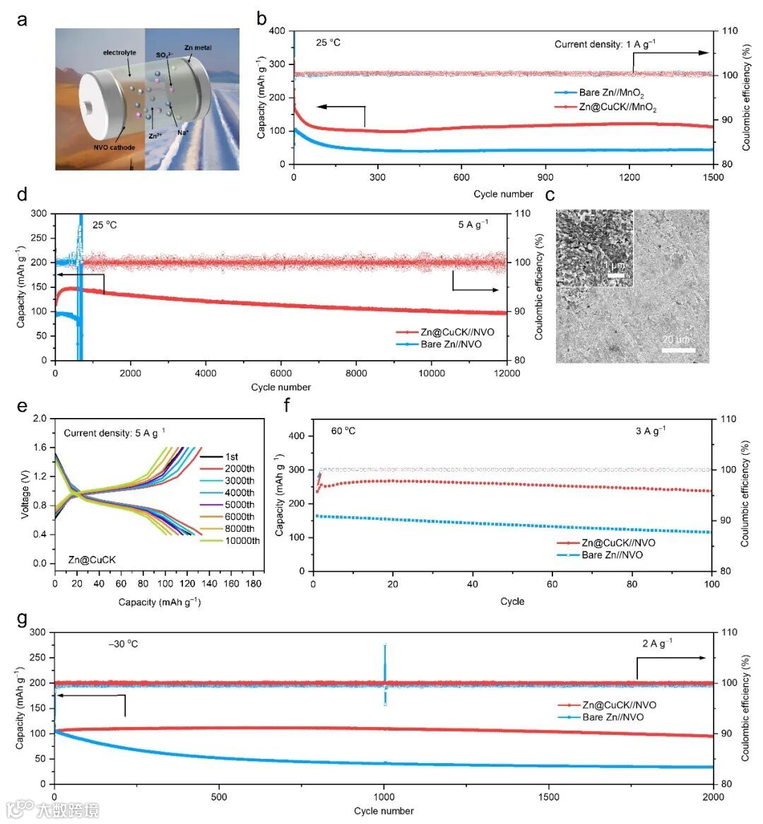 Figure 6. Electrochemical performance of the full cells at wide temperature. (a) Schematic diagram of the full battery under different environmental circumstances. (b) Long-term cycling performance of bare Zn||MnO2 and Zn@CuCK||MnO2 full cells at 1 A g−1. (c) SEM images of Zn@CuCK after 100 cycles at 1 A g−1. (d) Long-term cycling performance and (e) corresponding GCD curves of Zn@CuCK||NVO full cells at 25 °C, 5 A g−1. Long-term cycling performance of Zn@CuCK||NVO and bare Zn||NVO full cells (f) at 60 °C, 3 A g−1 and (g) at −30 °C, 2 A g−1.