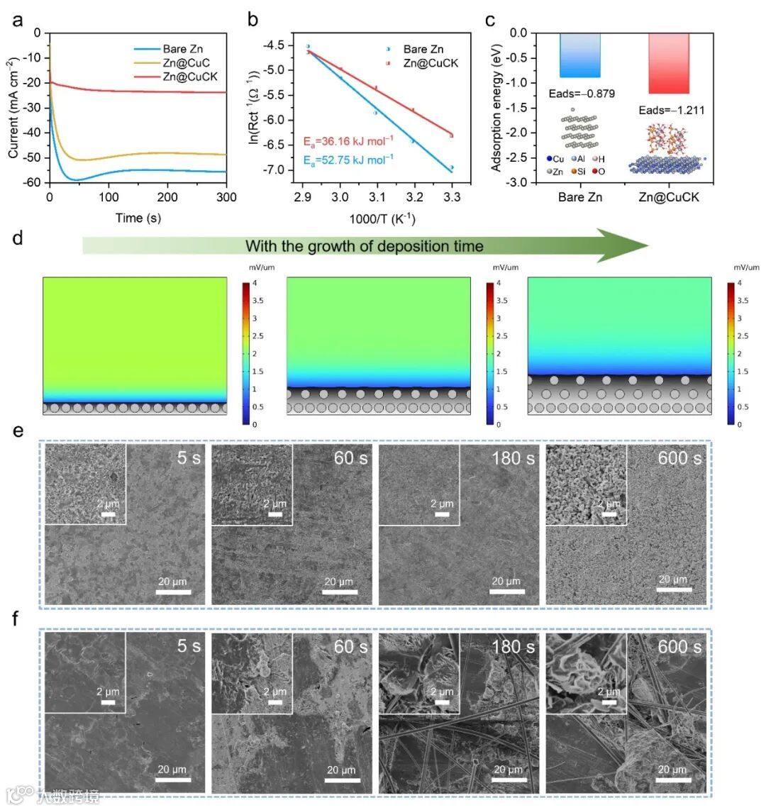 Figure 4. (a) Chronoamperograms (CA) of bare Zn, Zn@CuC and Zn@CuCK at a −200 mV overpotential. (b) Arrhenius curves and comparison of activation energies for different Zn anodes. (c) Adsorption energy of Zn atom on bare Zn and Zn@CuCK substrates. (d) Electric field distribution of Zn@CuCK anode with gradient CuxZny alloy during the Zn deposition process by finite element method simulation. (e, f) SEM images of the zinc surface in (e) Zn@CuCK anodes (CuCK layer removed) and (f) bare Zn after deposition at 5 mA cm−2 for 5, 60, 180, and 600 s, respectively.