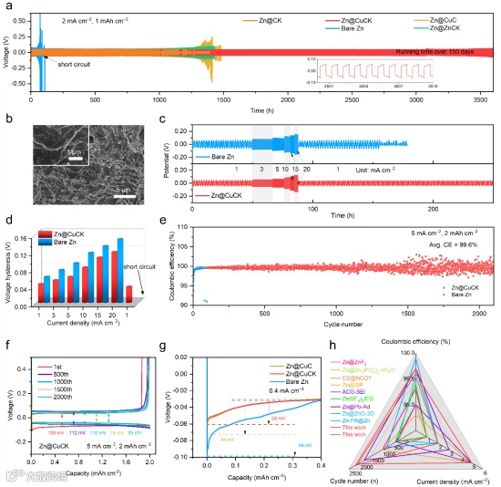 Figure 5. Plating/stripping cycling stability of Zn@CuCK symmetrical and asymmetrical cells. (a) Long-term galvanostatic cycling performance of symmetrical cells with different electrodes. (b) SEM images of Zn@CuCK in symmetrical cells after 40 cycles at current densities of 2 mA cm−2. (c) Rate performance of symmetrical cells and (d) corresponding voltage hysteresis at different current densities from 1 to 20 mA cm−2, at fixed charge/discharge capacity of 1 mAh cm−2. (e) CEs of asymmetrical cells with Zn@CuCK and bare Zn anode at a current density of 5 mA cm−2 with an areal capacity of 2 mAh cm−2. (f) Voltage profiles of Zn@CuCK||Cu asymmetrical cell at the current density of 5 mA cm−2 and areal capacity of 2 mAh cm−2. (g) Nucleation overpotential on different Zn substrates at 0.4 mA cm−2 and 0.4 mAh cm−2. (h) Comparison of Zn@CuCK with other reported Zn anodes (details seen in Table S5).