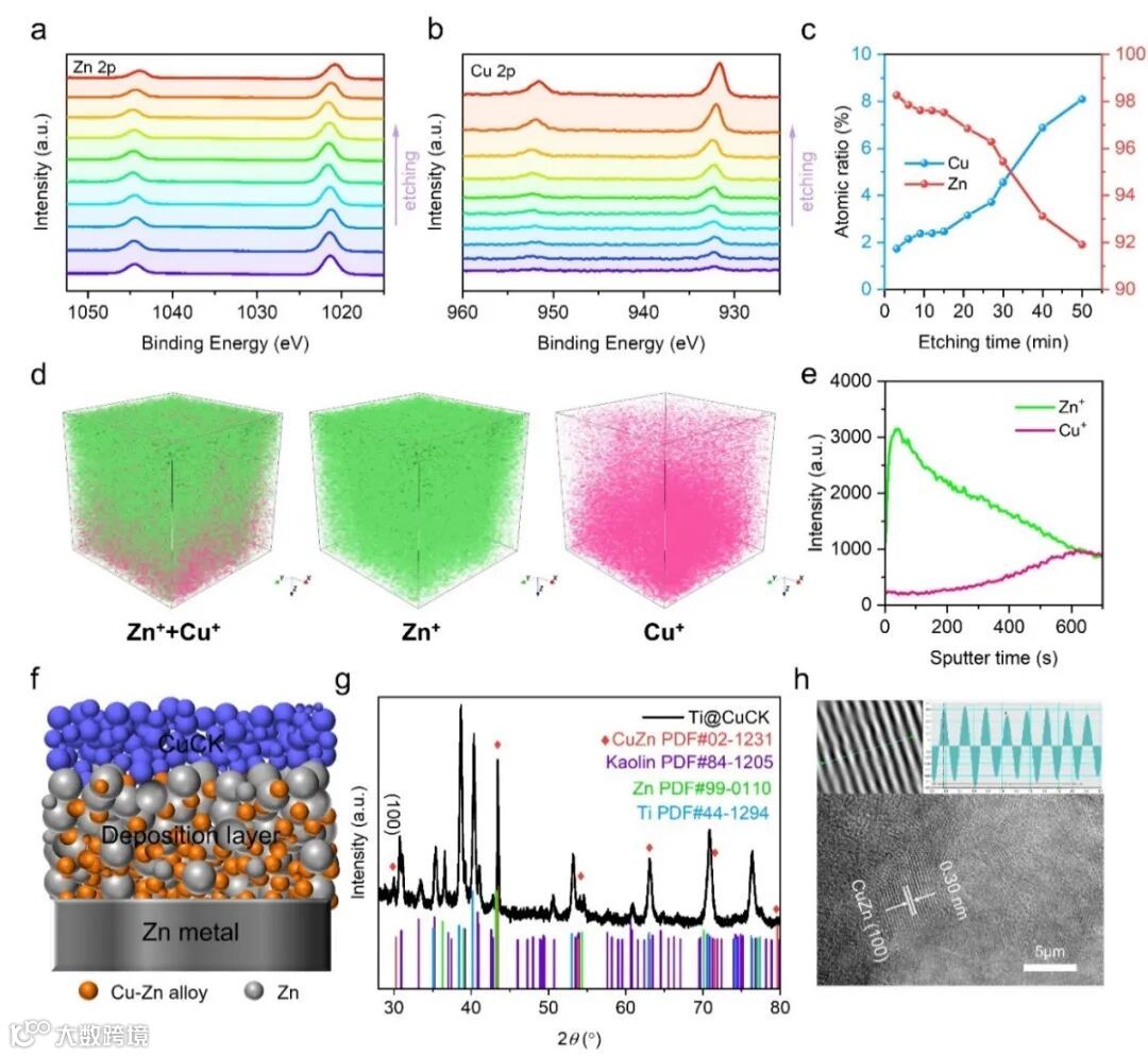 Figure 3. Analysis and characterization of CuCK gradient layer. (a, b) Depth etching analysis from Zn 2p and Cu 2p XPS spectra of plated (0.4 mA cm−2 and 0.1 mAh cm−2) Zn@CuCK anode (CuCK layer removed). (c) Atomic ratio of Zn and Cu vs. etching time according to the XPS results in (a, b). (d) 3D render overlay of Zn+ and Cu+ distributions and (e) Corresponding depth profiles of time-of-flight secondary ion mass spectrometry (TOF-SIMS) analysis of plated Zn@CuCK anode in symmetrical cell. (f) Schematic of galvanically induced and galvanostatically plated gradient Cu-Zn layer on Zn@CuCK anode. (g) XRD pattern and (h) HRTEM image of the Ti@CuCK electrode after 5 cycles.