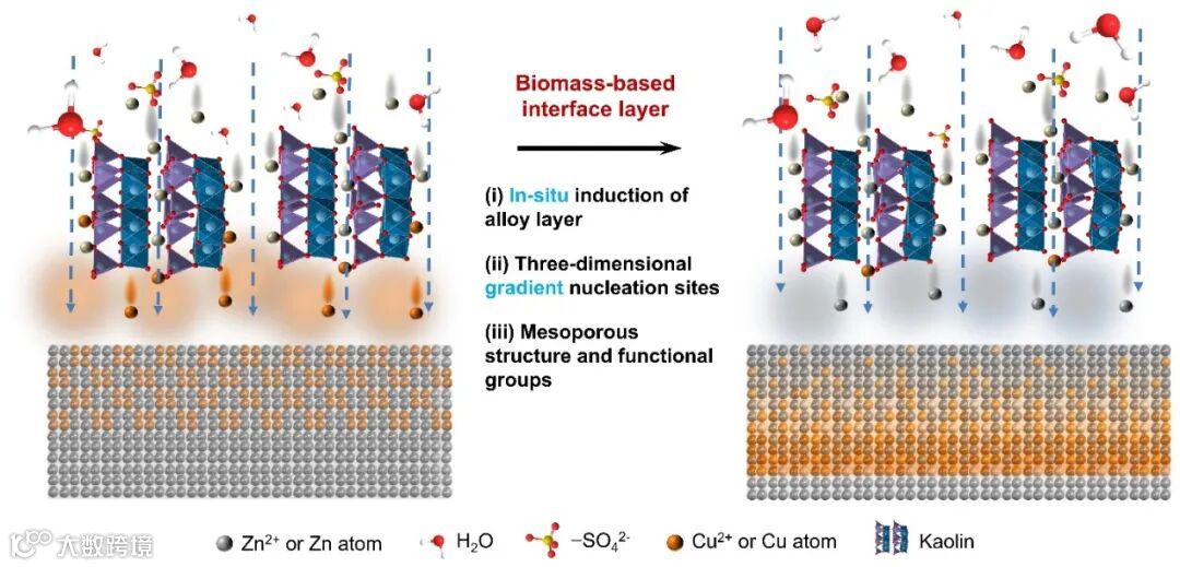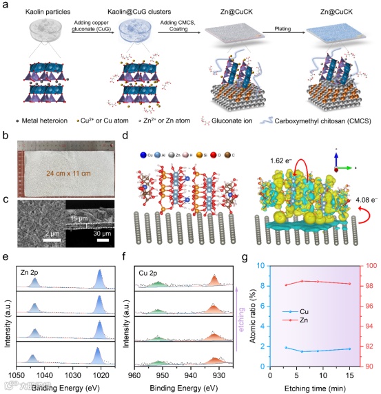 该生物质基锌负极界面层由葡萄糖酸铜、高岭土与羧甲基壳聚糖混合形成。高岭土作为有效的铜离子载体,不仅可以通过原位置换,提升与锌箔的结合力,同时还可以在锌沉积的过程中,实现铜离子的“缓释”,从而在界面层中实现原位诱导梯度合金亲锌位点的形成。