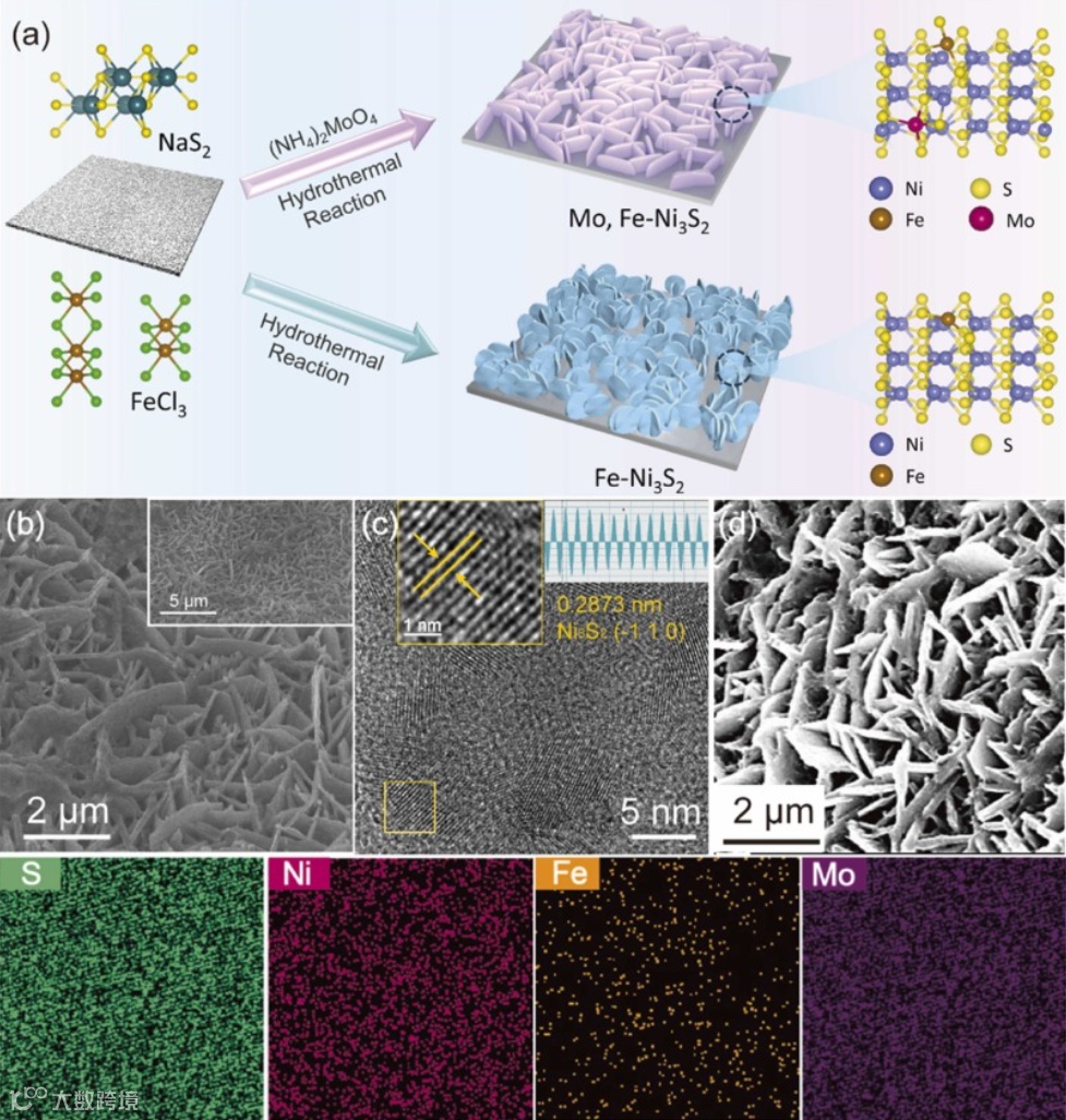 图 2. Mo,Fe-Ni3S2的制造工艺示意图以及SEM 、HRTEM、STEM 图像以及 mapping图。