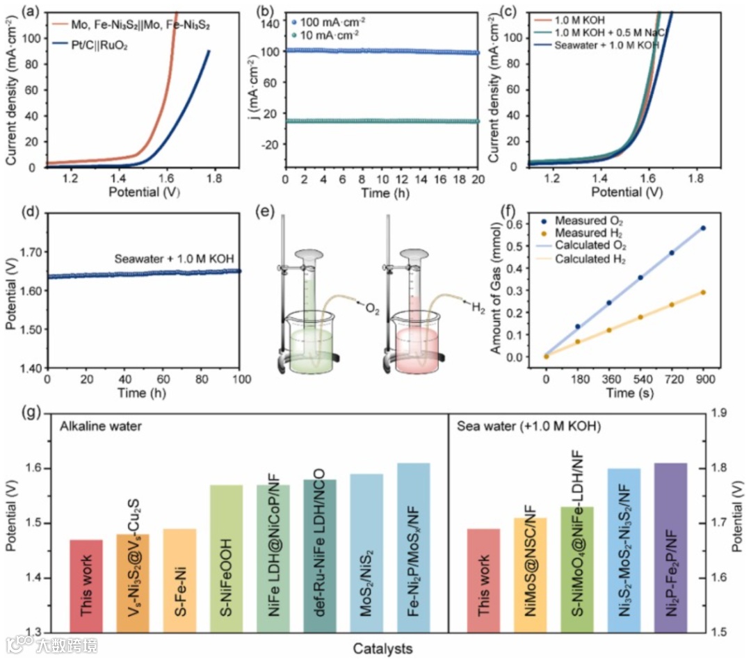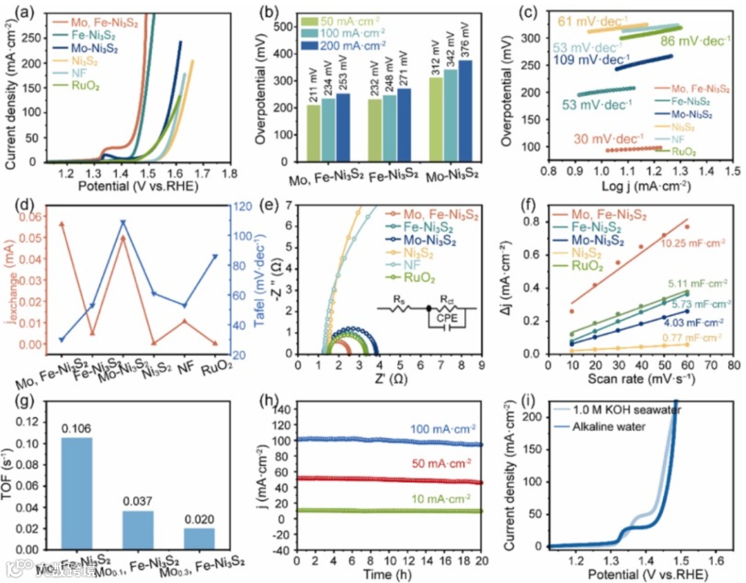 Mo,Fe-Ni3S2为了达到电流密度为10 mA cm-2,Mo,Fe-Ni3S2需要59 mV的过电位。此外,Mo,Fe-Ni3S2电催化剂还具有更小的塔菲尔斜率、更大的交换电流密度和更小的电化学阻抗,同时具有更多的活性位点和暴露边缘。测试了Mo,Fe-Ni3S2的海水HER活性。结果表明,在182 mA cm−2的电流密度下,海水HER性能开始优于碱性HER,综合这些结果可以认为Mo,Fe-Ni3S2可以应用于海水HER。通过双电极电解槽系统的测试,Mo,Fe-Ni3S2||Mo,Fe-Ni3S2在10 mA cm-2时仅需1.47 V的低电压,在100 mA cm−2的电流密度下,工作20 h后仍保持96.8%的初始电流密度。此外,Mo,Fe-Ni3S2||Mo,Fe-Ni3S2在1.0 M KOH介导的碱性天然海水中只要1.43 V就可以达到10 mA cm-2的电流密度,在100 mA cm−2时,总水分解电压为1.69 V。