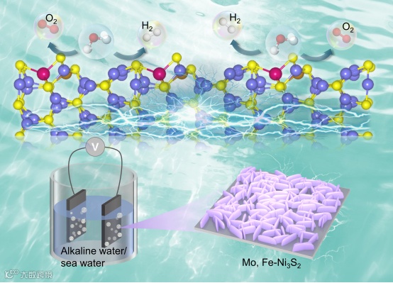 图1. Mo, Fe-Ni3S2催化剂在碱性水/海水分解中的应用机制。