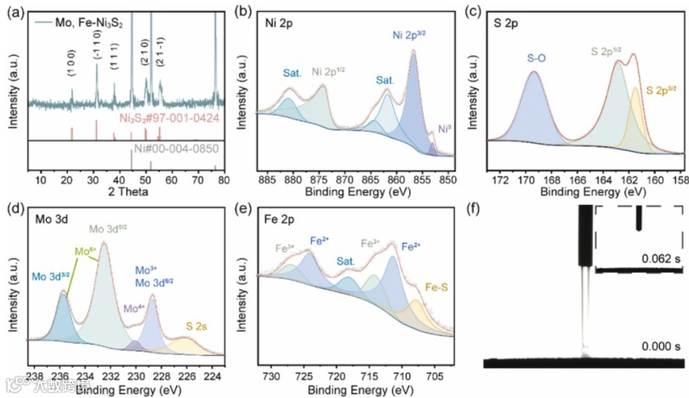 图 3. Mo,Fe-Ni3S2的 XRD 图和XPS 光谱以及动态接触角测试。