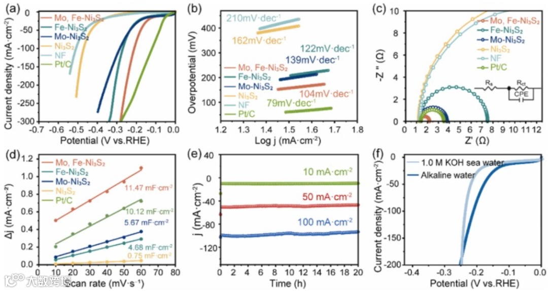 图5. Mo,Fe-Ni3S2的HER电化学测试与分析图。