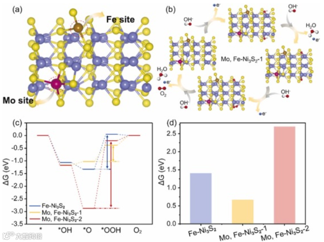 图7. Mo,Fe-Ni3S2在OER反应进程中的相关吸附能计算。