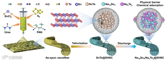 钠离子电池(SIBs)因其丰富的资源和类似于锂离子电池(LIBs)的电化学储能机制而备受关注。然而,石墨作为广泛使用的LIBs负极材料,其钠存储能力受到Na+原子半径较大(Na+: 1.02 Å vs. Li+: 0.76 Å)的限制,导致扩散动力学缓慢、体积应变大、功率/能量密度降低、循环寿命短。因此,当务之急是开发具有高比容量、优异倍率性能和优良循环稳定性的先进负极材料。硫族元素,包括S、Se和Te,因其涉及多次电子转移而具有较高的钠储存理论比容量。其中,半金属Te因其高导电性(在环境条件下,Te: 2 × 10−4 mS m−1 vs. S: 5 × 10−22 mS m−1 vs. Se: 1 × 10−10 mS m−1)和高密度(Te: 6.24 g cm−3 vs. S:约2.0 g cm−3 vs. Se: 4.81 g cm−3)而具有优异的电子传递效率和高体积比容量。以往的研究已经探索了Te基材料,如负载CeO2量子点和Te的三维分层多孔碳(Te/CeO2-QDs/HPC纳米复合材料)和限制在多孔碳纳米棒(Te/Cp)中的Te,证明了提高的能量密度和循环稳定性。然而,这些研究通过透明电池的光学照片发现了中间产物(多碲化钠,NaxTey)的溶解现象,但这尚未受到太多关注和深入分析。