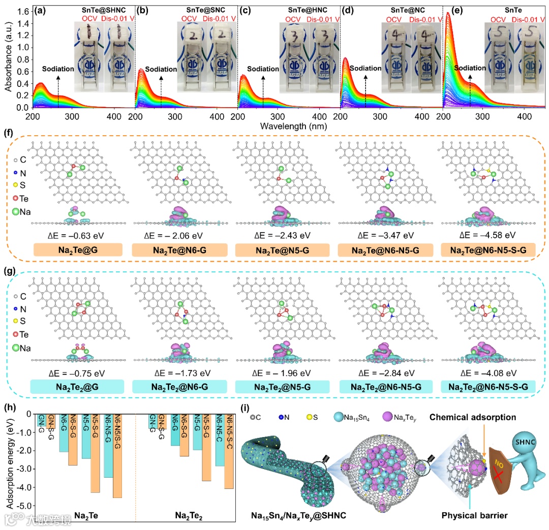 图5(a)SnTe@SHNC、(b)SnTe@SNC、(c)SnTe@HNC、(d)SnTe@NC和(e)SnTe电极在0.1 A g−1初始放电过程中的原位紫外可见吸收光谱(图5e和S2h均为无碳基底SnTe的原位紫外可见光谱)。插图是透明电池放电前后的相应光学照片。(f)Na2Te和(g)Na2Te2在不同碳基底上的吸附构型和相应的吸附能。(h)NaxTey在不同类型N掺杂和S/N共掺杂碳基底上的吸附能比较。(i)SHNC抑制NaxTey穿梭的示意图。
