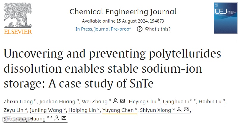 近日,广东工业大学黄少铭教授、张伟副教授以及熊世云教授在Chemical Engineering Journal期刊上发表题为“Uncovering and preventing polytellurides dissolution enables stable sodium-ion storage: A case study of SnTe”的研究工作。该工作首次发现,在合金型和转换型金属碲化物(MTe)负极中,中间产物(NaxTey)的溶解和穿梭是导致容量快速衰减的原因。基于这一发现,我们提出了一种新的结构工程策略,将超细SnTe纳米颗粒限制在纤维碳基体中,促进NaxTey的顺利固定和高度可逆转化。先进的原位/非原位测试和密度泛函理论计算阐明了NaxTey的演化和穿梭机制,突出了碳基体的范德华势垒以及N和S掺杂位点对Na2Te2和Na2Te中间体的显著化学吸附。值得注意的是,通过优化N和S的掺杂含量和键合类型,增强了NaxTey的化学吸附能力,从而使嵌入在高含量N和S共掺杂碳纤维基体中的SnTe(SnTe@SHNC)具有优异的稳定性。精心制作的SnTe@SHNC复合材料表现出优异的性能,在1.0 A g−1下可承受超过1000次循环,每圈循环容量衰减率仅为0.028%。这项工作为我们深入了解控制NaxTey在先进SIBs的耐用MTe负极设计中的关键作用提供了宝贵的启示。