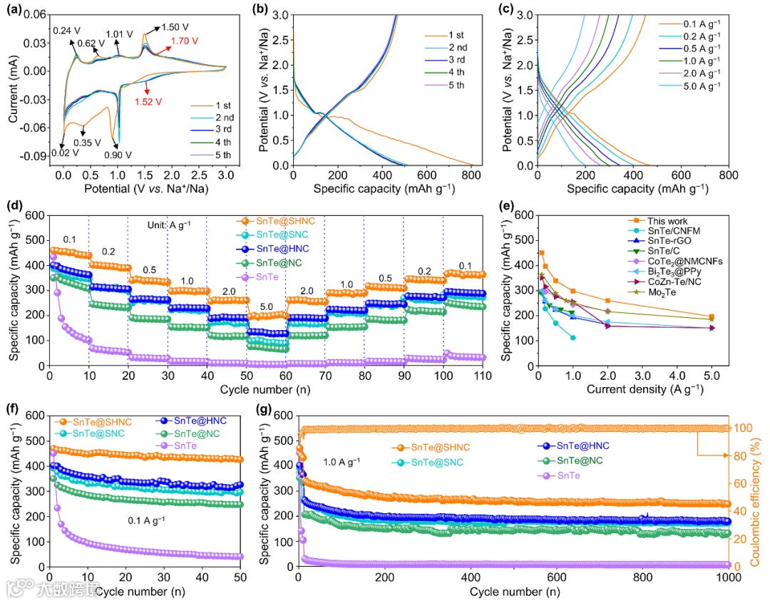 图2 SnTe@SHNC电极的(a)CV曲线、(b)0.1 A g–1下前五圈的放电/充电曲线、(c)在0.1–5.0 A g–1不同电流密度下的放电/充电曲线。(d)SnTe@SHNC、SnTe@SNC、SnTe@HNC、SnTe@NC和SnTe电极的倍率性能。(e)SnTe@SHNC与最近报道的MTe负极的钠储存倍率性能的比较。SnTe@SHNC、SnTe@SNC、SnTe@HNC、SnTe@NC和SnTe电极在(f)0.1和(g)1.0 A g–1下的循环性能。