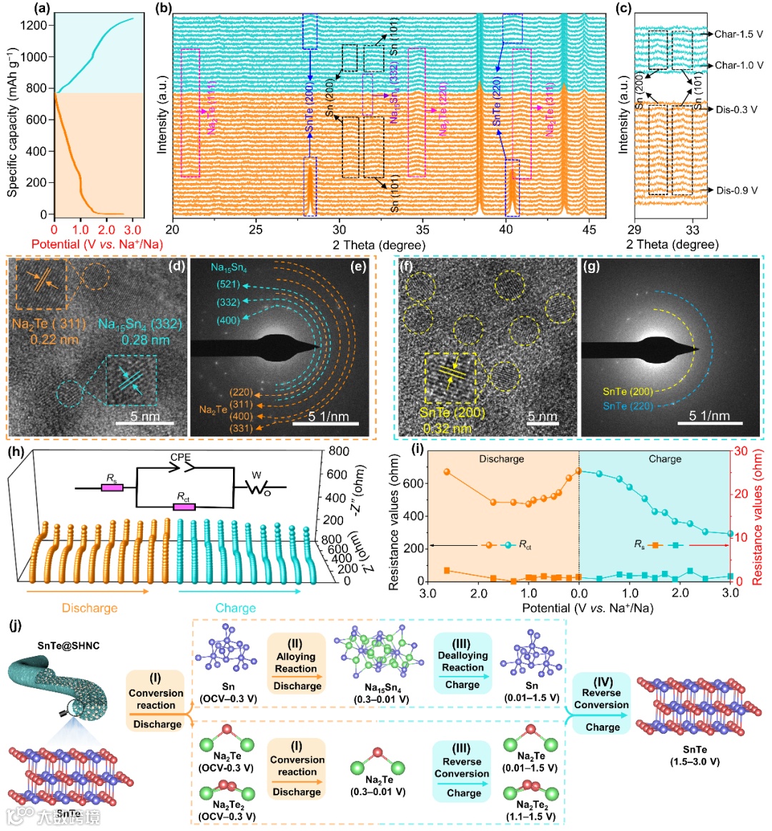 图3 (a)初始放电/充电曲线和(b)相应的原位XRD图谱。(c)放大的原位XRD图谱。SnTe@SHNC电极(d,e)放电至0.01 V和(f,g)充电至3.0 V时的HRTEM和相应的SAED图像。(h)SnTe@SHNC电极在0.05 A g−1下在不同放电/充电状态下的原位EIS曲线和(i)EIS曲线对应的拟合电阻。(j)SnTe@SHNC不同阶段储钠机理示意图。