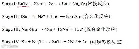 根据原位XRD、非原位XRD/TEM和CV曲线的分析结果,可以将SnTe@SHNC电极的反应机理划分为4个阶段,描述如下: