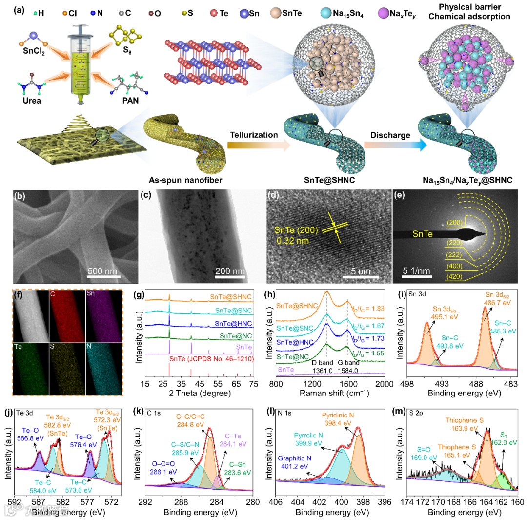 图1(a)SnTe@SHNC的合成示意图。SnTe@SHNC的(b)SEM、(c)TEM、(d)HRTEM、(e)SAED和(f)EDS图像。SnTe@SHNC、SnTe@SNC、SnTe@HNC、SnTe@NC和SnTe的(g)XRD 图样以及(h)拉曼光谱。SnTe@SHNC(i)Sn 3d、(j)Te 3d、(k)C 1s、(l)N 1s和(m)S 2p的XPS高分辨率光谱。