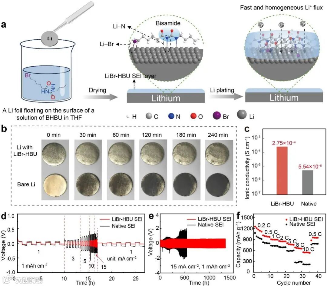 通过新型有机分子BHBU与锂金属表面的反应,原位构筑了有机/无机杂化SEI(LiBr-HBU)层(图1a),该SEI层中有机/无机成分共存的特点和双酰胺极性基团的存在使其具有“刚柔并济”的结构特性、均匀致密的薄膜形貌以及与锂箔紧密结合的能力。同时,这类SEI层也表现出优异的空气稳定性和高的Li+电导率(2.75×10−4 S cm−1)(图1b, c)。