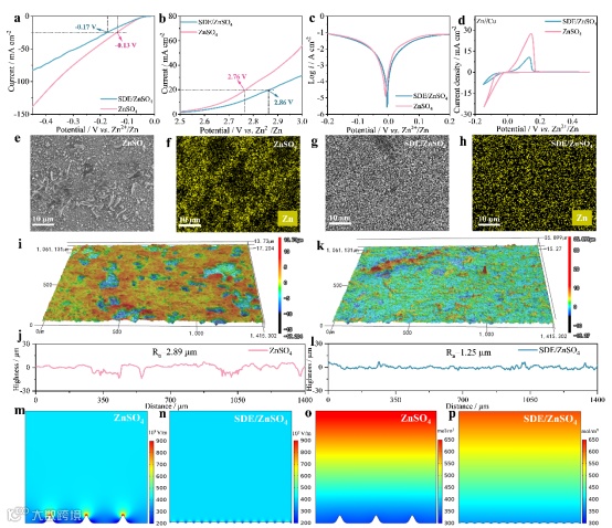 图4. 抗腐蚀效果及锌沉积行为。a-b) ZnSO4和SDE/ZnSO4的LSV曲线; c)锌负极在不同电解质下的Tafel图; d)不同电解质在5 mV s−1下Zn/ Cu不对称电池的CV曲线; e-h)不同电解质下1 mA cm−2条件下镀锌100 s后铜箔的SEM图像和能谱图; i-l)在不同的电解液中以1mA cm−2的温度镀锌2h后的共聚焦激光扫描显微镜(CLSM)图像及其对应的表面粗糙度曲线; m-n) ZnSO4和SDE/ZnSO4对Zn电极电场分布的模拟; o-p)模拟ZnSO4和SDE/ZnSO4在Zn电极上的Zn2+浓度场分布。
