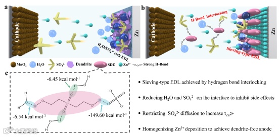 图1. a-b)含ZnSO4和SDE/ZnSO4电解质的Zn//MnO2全电池示意图; c) SDE与H₂O和SO₄²⁻形成氢键示意图及计算得到的不同氢键受体和氢键给体之间的氢键相互作用能。