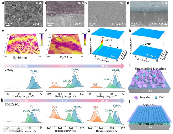 图5. ZnSO4和SDE/ZnSO4电解液循环后Zn负极界面的表征。a-d) 50次循环后的平面和截面SEM图像; e-f) 10次循环后的AFM三维高度图像; g-h)非原位XRD图谱; i)在ZnSO4中经过20次循环形成的SEI层的s2p谱的XPS深度剖面; j) ZnSO4中不稳定的锌负极界面示意图; k) SDE/ZnSO4中20次循环后SEI层S 2p谱的XPS深度剖面; l) SDE/ZnSO4稳定负极界面示意图。