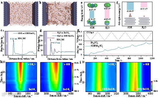 图2. 筛分型双电层。a-b) ZnSO4和SDE/ZnSO4电解质Zn//Zn对称电池系统的分子动力学模拟快照; c) MD模拟得到的SDE/ZnSO4电解质中SDE相对于锌负极的浓度分布; d) MD模拟得到的不同电解质中的H₂O相对于锌负极的浓度分布; e)计算得到的SDE和H₂O的HOMO和LUMO能级; f) SDE和H₂O在Zn(002)表面的吸附方式及对应的吸附能; g)不同电解质下基于5次CV试验中电化学石英晶体微天平(EQCM)的质量变化; h-i)不同电解液镀锌过程中锌负极表面的原位拉曼光谱。