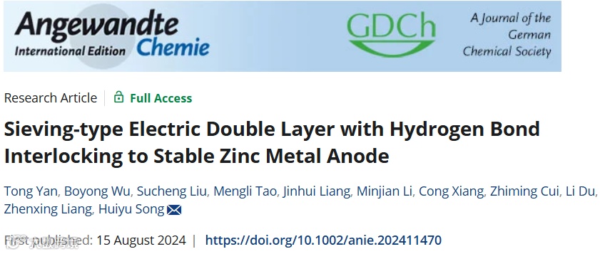 近日,来自华南理工大学的宋慧宇教授和梁振兴教授,在国际知名期刊Angew. Chem. Int. Ed.上发表题为“Sieving-type Electric Double Layer with Hydrogen Bond Interlocking to Stable Zinc Metal Anode”的观点文章。该文章通过将多氢键位点添加剂2, 2'-磺酰基二乙醇(SDE)加入水系ZnSO₄电解质中,利用SDE与H₂O和SO₄²⁻之间的强氢键作用构建筛分型双电层。一方面,SDE取代了吸附在锌负极表面的H₂O和SO₄²⁻,将其从双电层中排出,从而减少界面处H₂O和SO₄²⁻的含量;另一方面,在Zn²⁺去溶剂化过程中,SDE与H₂O/SO₄²⁻之间的强氢键相互作用可以捕获这些物质,进一步降低它们在界面处的含量,从而抑制副反应。此外,SDE还可以通过氢键捕获SO₄²⁻阴离子,限制阴离子在电解液中的扩散,从而提高Zn2+的迁移数,促进Zn的无枝晶沉积和生长。因此,使用SDE/ZnSO4电解质可以在Zn//Zn对称电池和Zn//MnO2全电池中实现优异的循环稳定性,寿命分别超过3500小时和2500次循环。
