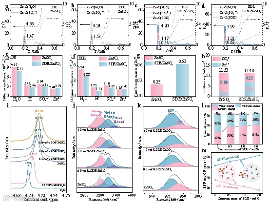 图3. ZnSO4和SDE/ZnSO4电解质的基本性质。a-d) MD模拟得到的BE和EDL中的RDF和配位数; e-f) H₂O、H+、Zn2+、SO₄²⁻在BE和EDL中的扩散系数; g) Zn2+的迁移数; h)离子电导率; i) 0.5 vol% SDE、0.5 vol% SDE和1.0 vol% SDE中D2O分子在2mol L-1 ZnSO4电解质中的2H NMR谱; j) O-H拟合拉曼光谱; k) v-(SO₄²⁻)的拟合拉曼光谱; l)强、中、弱氢键比例; m) SSIP和CIP的比例。