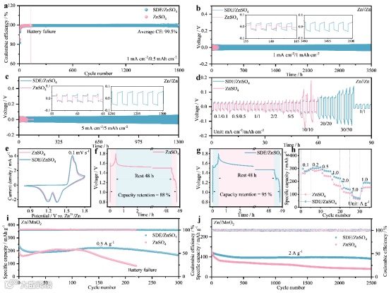 得益于筛分型双电层对H₂O和SO₄²⁻阴离子有关的副反应以及锌枝晶的抑制,使用SDE/ZnSO4电解质可以在Zn//Zn对称电池和Zn//MnO2全电池中实现优异的循环稳定性,寿命分别超过3500小时和2500次循环。