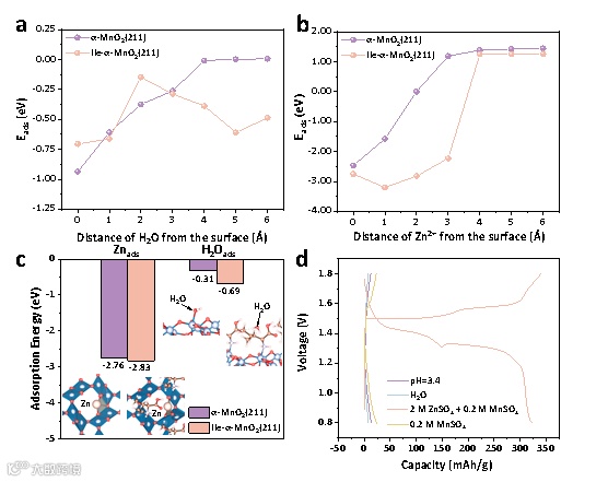 从图4可以看出,原始α-MnO2(211)和Ile-α-MnO2(211)体系的Eads均呈下降趋势,表明两种体系均没有Zn2+吸附障碍。值得注意的是,在Ile涂层存在的情况下,当水接近α-MnO2(211)表面时,至少存在0.46 eV的能量势垒,阻止水进入电极表面。因此,涂在α-MnO2上的Ile分子层有效地吸引和促进Zn2+穿透涂层,同时阻止水渗透到α-MnO2(211)表面,从而缓解α-MnO2正极的副反应和腐蚀。