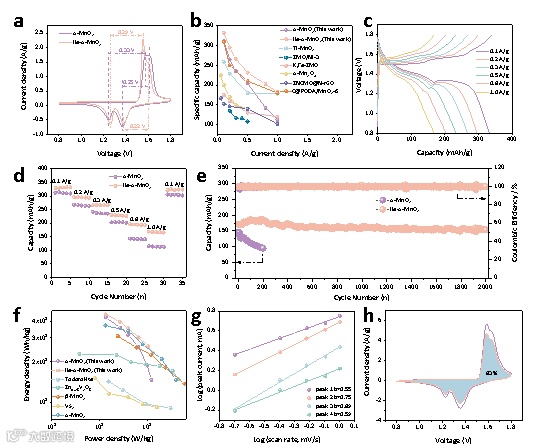 如图3所示,Ile-α-MnO2即使在高电流密度为1.0 A/g时,也表现出优异的长期循环稳定性,2000次循环后的可逆容量为153.8 mAh/g,容量保持率为85%。所制备的电池装置在134.8 W/kg功率密度下实现了448.8 Wh/kg的高能量密度。