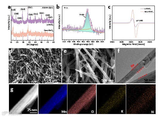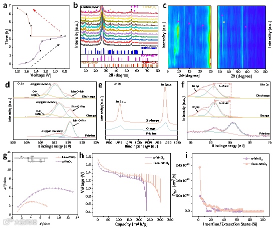 如图5所示,利用GITT和EIS分别计算了Zn2+在电极中嵌入/脱出过程中的离子扩散系数和Rct值,结果表明Ile-α-MnO2正极的DZn2+为2.3 × 10-11到 1.2 × 10-14 cm2/s、Rct值为6.3 Ω,都明显优于α-MnO2正极,显示了其优异的速率性能。非原位XRD进一步分析电极在不同位点的结构演变,揭示了其在充放电过程中Zn2+嵌入和脱出行为。结合XPS表征在循环过程中,样品的成分没有发生变化,展现出优异的结构稳定性和可逆性。