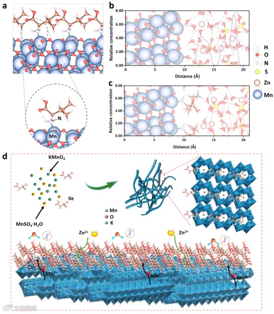 图1 α-MnO2(211)表面有机-无机杂化界面及Zn2+浓度分布图,以及Ile-α-MnO2纳米棒的合成示意图。