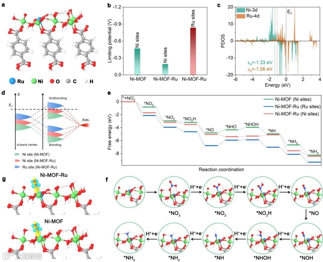图1. Ru掺杂Ni-MOF阵列结构用于硝酸根还原制氨性能的理论计算。