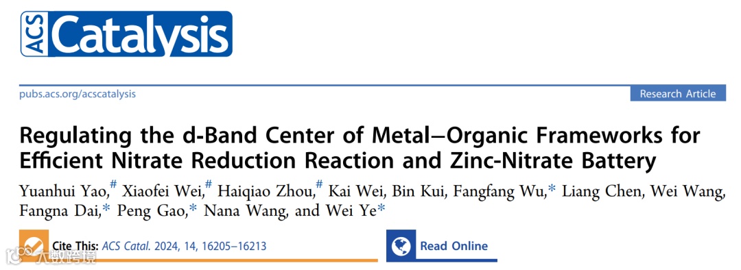 近日,来自杭州师范大学叶伟副教授、高鹏教授与中国石油大学的戴昉纳教授,浙江工业大学的毋芳芳副教授合作,在国际知名期刊ACS Catalysis上发表题为“Regulating the d‑Band Center of Metal−Organic Frameworks for Efficient Nitrate Reduction Reaction and Zinc-Nitrate Battery”的研究文章。该研究报道了一种通过调控金属有机框架的d-带中心策略来提升硝酸根还原制氨和锌-硝酸盐电池性能。