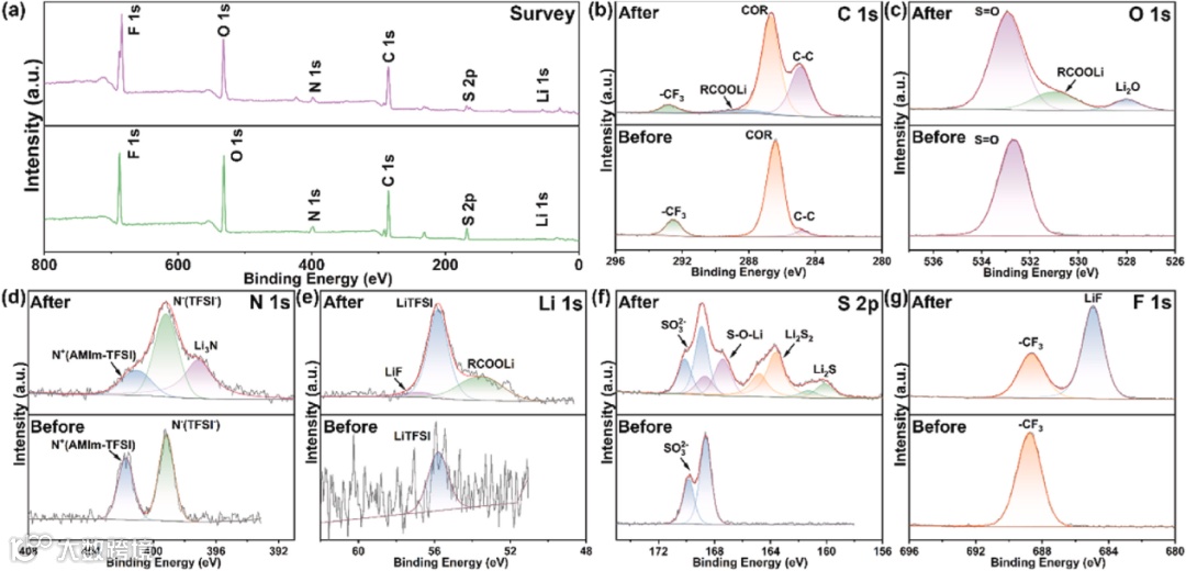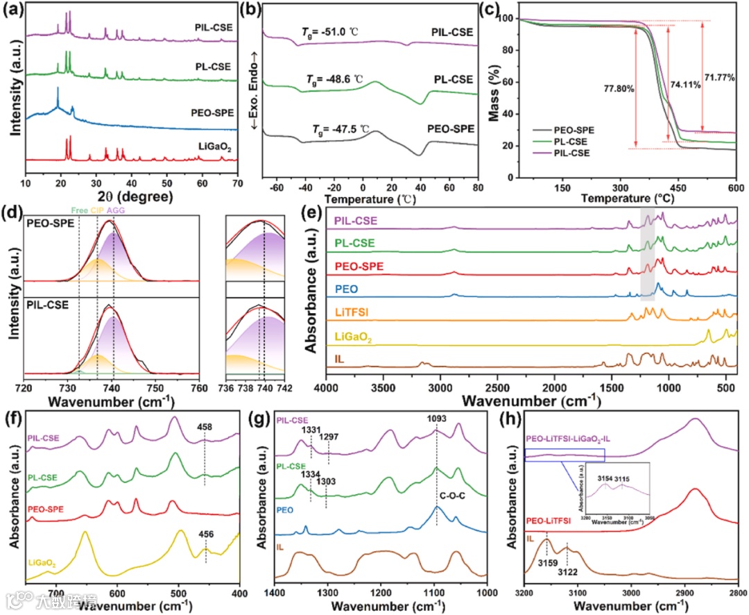 差示扫描量热法(DSC)进一步表明,PIL-CSE具有更低的玻璃化转变温度(-51.0℃),说明LiGaO2和AMIm-TFSI的加入降低了PEO的结晶度。通过热重分析(TGA)测试,电解质的分解温度均在360℃以上,表明了了LiGaO2和AMIm-TFSI的加入,并未牺牲PEO电解质的热稳定性。此外,拉曼光谱表明LiGaO2和AMIm-TFSI与阴离子的相互作用促进了锂盐的解离。