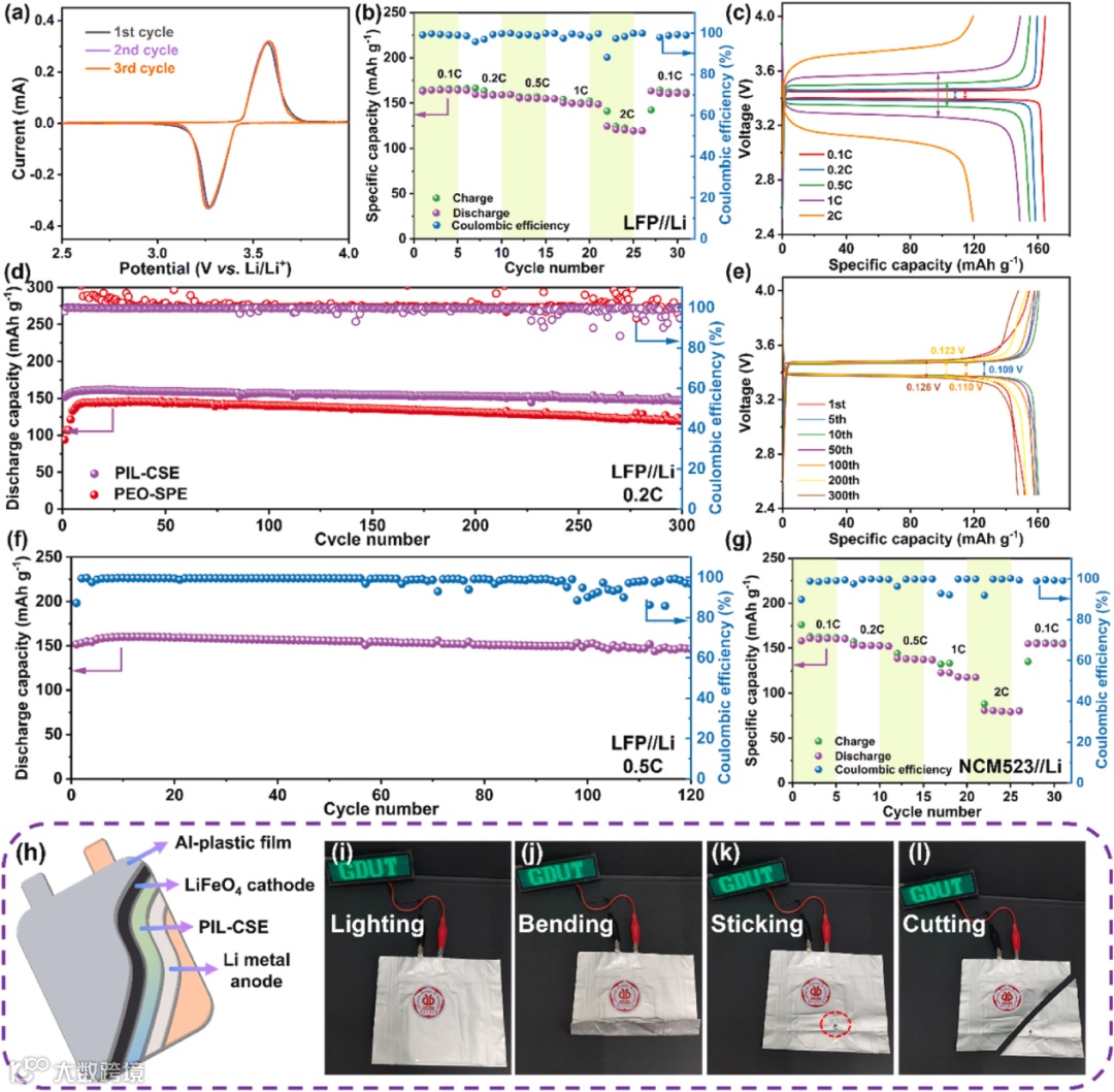 在60℃条件下,LiFePO4/PIL-CSE/Li固态电池在0.1、0.2、0.5、1C和2C分别具有164.2、158.5、154.8、148.6和119.4 mAh g-1的比容量。在0.2C下循环300次后,LiFePO4/PIL-CSE/Li固态电池保持了超过147.3 mAh g-1的可逆比容量,容量保持率为97.0%。此外,组装了LiFePO4//Li软包全电池,可以观察到,在折叠和弯曲时,绿色LED仍然发光,说明LiFePO4/PIL-CSE/Li具有良好的柔韧性。即使在针刺和切割状态下,LiFePO4/PIL-CSE/Li软包电池仍然可以照亮LED。说明PIL-CSE具有良好的柔韧性和较高的安全性,是柔性电子器件的潜在应用对象。