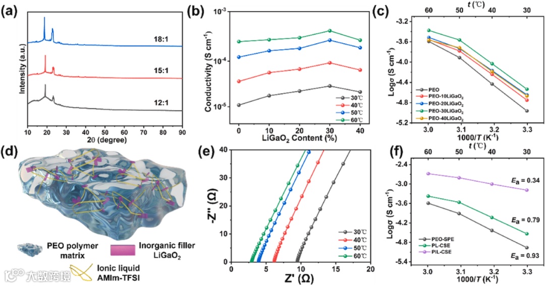 XRD测试表明,当EO: Li+的摩尔比为12:1时,PEO对应的本振峰明显减小,非晶态区增加。此外,引入30%浓度的LiGaO2具有最高的离子电导率,以及AMIm-TFSI与PEO的最佳质量比为2:5。根据Arrhenius方程,PIL-CSE的活化能低于PL-CSE和PEO-SPE的活化能,这可能是由于活性LiGaO2填料与离子液体的协同作用抑制了PEO的结晶,降低了离子浓度极化,促进了Li+的迁移。